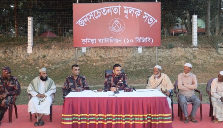 কুমিল্লা ব্যাটালিয়ন (১০ বিজিবি)-এর উদ্যোগে সীমান্ত এলাকার স্থানীয় জনসাধারণকে নিয়ে মাদক ও অপরাধমুক্ত সমাজ গঠনের লক্ষ্যে একটি জনসচেতনতামূলক সভার আয়োজন করা হয়েছে। মঙ্গলবার (১৪ জানুয়ারি) বিকালে কুমিল্লা ব্যাটালিয়নের বিবিরবাজার বিওপি এলাকার বিবিরবাজার মাঠে এ সভা অনুষ্ঠিত হয়।