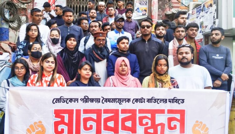 এসময় মানববন্ধনে বক্তারা তিনদিনের মধ্যে মেডিকেল ভর্তি পরীক্ষার ফলাফলে বৈষম্যমূলক কোটাপ্রথা বাতিলের দাবি জানান। অন্যথায়, বৈষম্য বিরোধী ছাত্র আন্দোলন পুনরায় বিপ্লবের ডাক দিবে। এ সময় বক্তারা বলেন, শত শত শহীদের রক্তের বিনিময়ে আমরা নতুন একটি বাংলাদেশ পেয়েছি। কিন্তু এই অন্তর্বর্তীকালীন সরকার সেই বিপ্লবকে ধারণ করতে সম্পূর্ণভাবে ব্যর্থ হয়েছে। মেডিকেলের ভর্তি পরীক্ষায় যে ৭৬ নম্বর পেয়েছে তার চান্স হয়নি, কিন্তু কোটার কারণে ৪০ নম্বর পেয়েও অনেকের চান্স হয়েছে। যে কোটার জন্য আমরা জীবন দিয়েছি সে কোটা কেন আবারো ফিরে এসেছে।