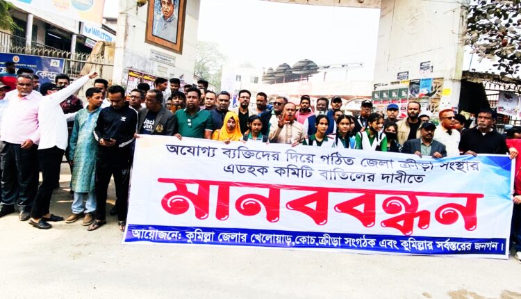 অযোগ্য লোক দিয়ে গঠন করা কুমিল্লা জেলা ক্রীড়া সংস্থার এডহক কমিটি বাতিলের জন্য মানববন্ধন ও স্মারকলিপি