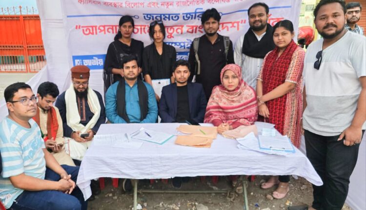 কুমিল্লায় জাতীয় নাগরিক কমিটি’র “আপনার চোখে নতুন বাংলাদেশ” শীর্ষক ক্যাম্পেইন জাতীয় নাগরিক কমিটি ও বৈষম্যবিরোধী ছাএ আন্দলোন কুমিল্লা মহানগর উদ্যোগে বুথভিত্তিক তিন দিনব্যাপী জনমত সংগ্রহের করা হয়েছে । এতে প্রায় ২০০০ মত সাধারণ জনগন তাদের নিজ হাতে নতুন বাংলাদেশ তৈরি করার জন্য মতামত দিয়েছে।