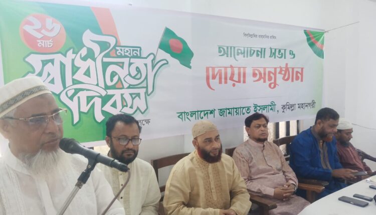 বাংলাদেশ জামায়াতে ইসলামী কুমিল্লা মহানগরী উদ্যোগে মহান স্বাধীনতা দিবসের উপলক্ষে আলোচনা সভা ও দোয়ার মাহফিল অনুষ্ঠিত হয়েছে।