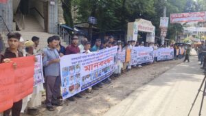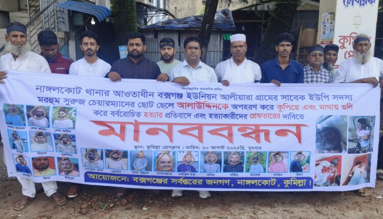 কুমিল্লায় সাবেক ইউপি সদস্যকে প্রকাশ্যে গুলি করে হত্যার বিচারের দাবিতে মানববন্ধন
