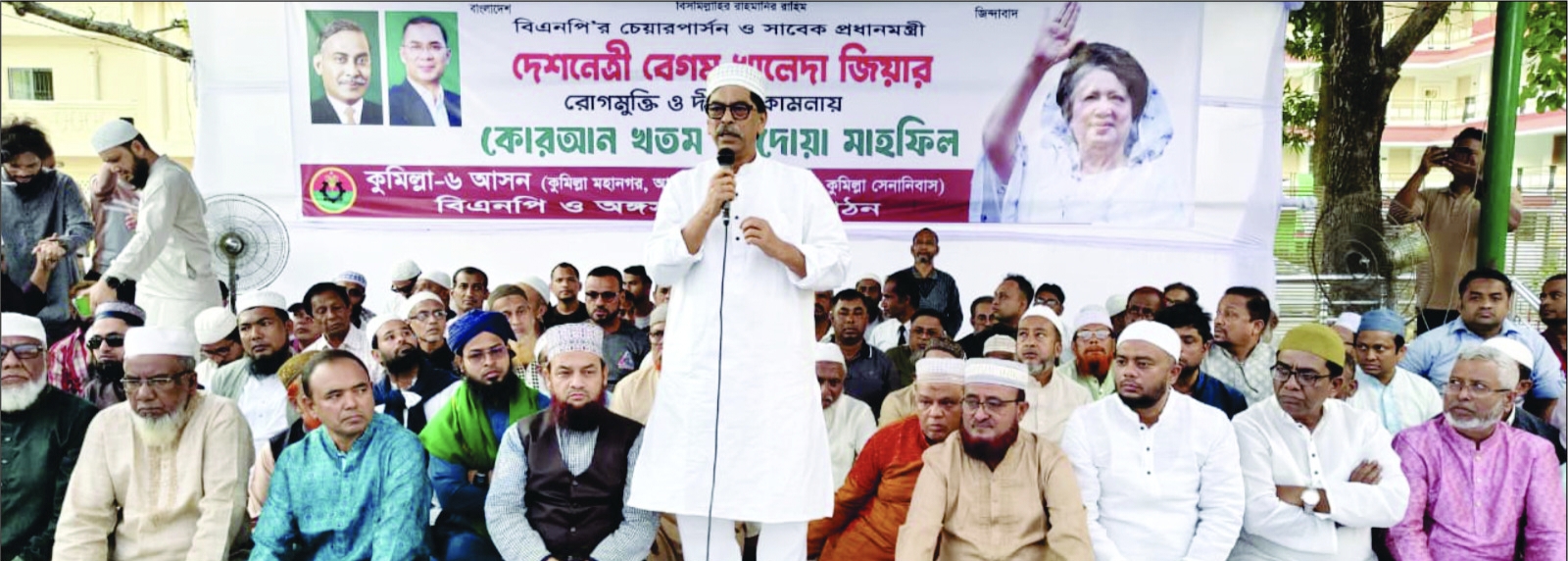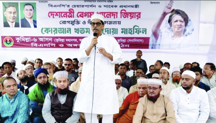 বৃহস্পতিবার (২৭ নভেম্বর) বিকালে কুমিল্লা নগরীর ঐতিহাসিক টাউন হল মাঠে সাবেক প্রধানমন্ত্রী বেগম খালেদা জিয়ার দ্রুত রোগমুক্তি কামনায় দিনব্যাপী পবিত্র কোরআন খতম শেষে অনুষ্ঠিত দোয়া মাহফিলে প্রধান অতিথির বক্তব্যে তিনি এসব কথা বলেন।